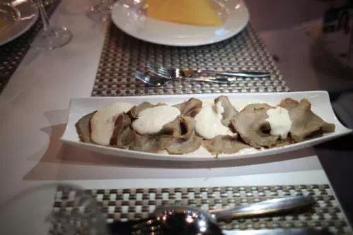 一道好的Carpaccio幾乎要用上一天的時(shí)間,因此意大利人一般也只有雙休日才能好好享受這道前菜。作為意大利經(jīng)典的開胃菜,長(zhǎng)相普通的Carpaccio讓人感覺(jué)出乎意料的鮮美,幾片薄得透明的生肉片最大限度地保留了牛肉的生鮮美味,柔軟綿延。