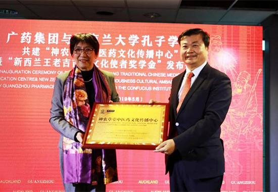 廣藥集團向奧克蘭大學孔子學院授予“神農(nóng)草堂中醫(yī)藥文化傳播中心”牌匾,寓意雙方將共同推廣中醫(yī)藥文化