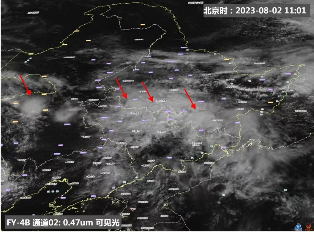 風(fēng)云四號B星可見光圖像顯示,黑龍江南部、吉林省北部以及內(nèi)蒙古中東部局地的對流活動明顯,出現(xiàn)白亮的上沖云頂。圖片來源:國家衛(wèi)星氣象中心