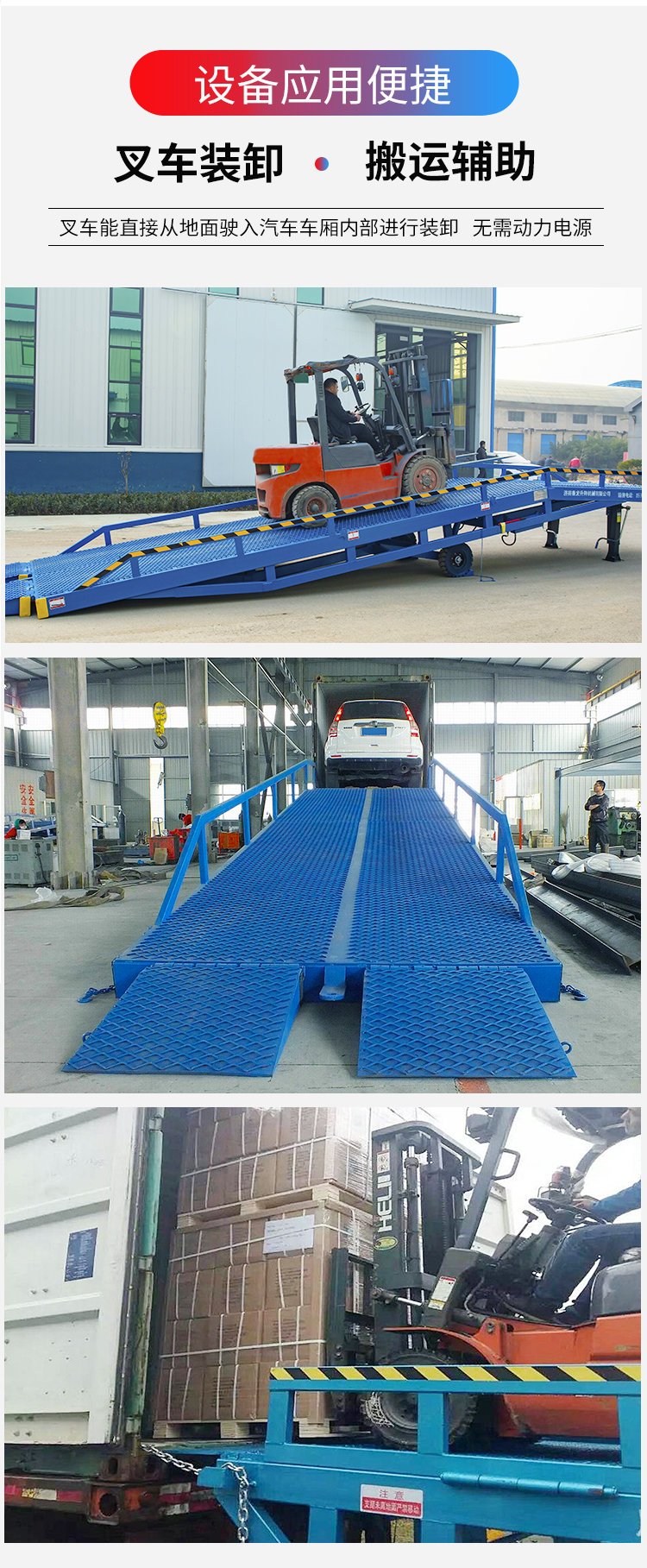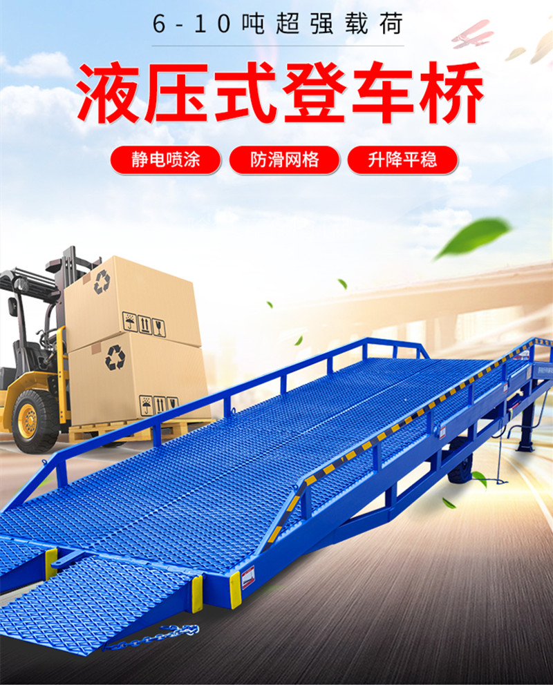 產(chǎn)品介紹:移動式液壓登車橋廣泛用于物流場所,是與叉車配合使用的貨物裝卸專用輔助設備,移動式液壓登車橋相當于一個移動的鋼結構斜坡,通過這個斜坡,叉車能直接從地面駛入汽車車廂內部進行批量裝卸作業(yè)。該液壓登車橋采用人工液壓動力,不需接動力電源。只需單人操作,即可實現(xiàn)貨物的安全快速裝卸。它可使您減少大量勞力,成倍提高裝卸作業(yè)效率,加快物料流通速度,獲取更大經(jīng)濟效益。